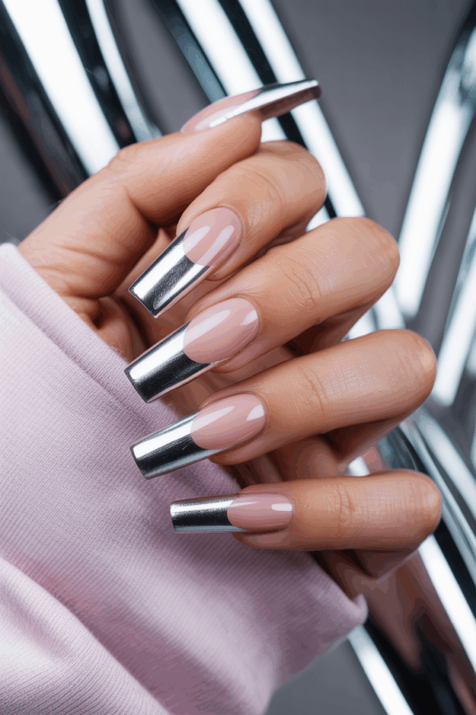 Shimmering chrome nails create a sleek and reflective look. They use special powders or polish to add a shiny, metallic finish to the nails. This effect makes the manicure stand out by catching the light from different angles.