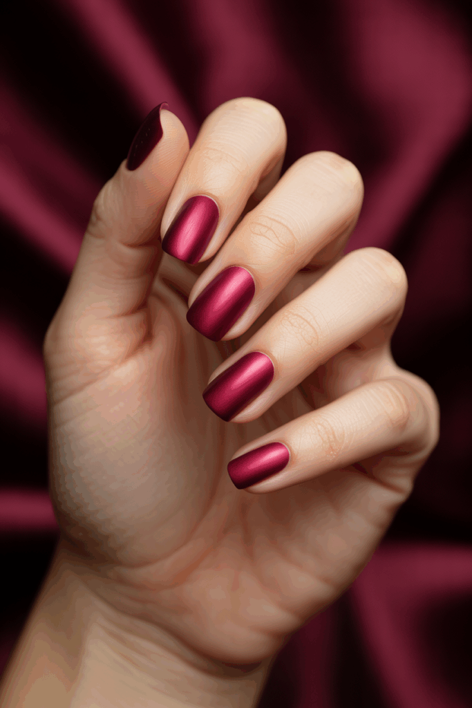 This design features a rich, deep burgundy color with a satin finish. The satin effect creates a smooth, soft shine that is less glossy than traditional polish. It gives the nails an elegant and understated look.