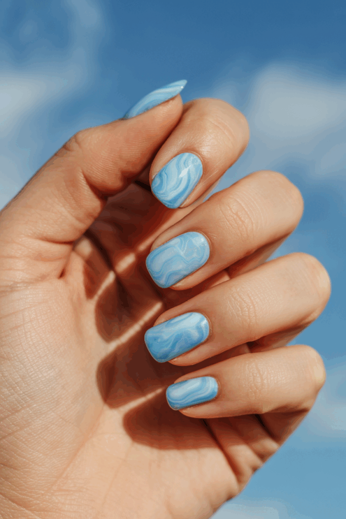 The sky blue marbled look combines soft blue tones with delicate swirls of white. This design mimics the calm and smooth patterns seen in the sky or water. It creates a fresh and elegant effect on acrylic nails.