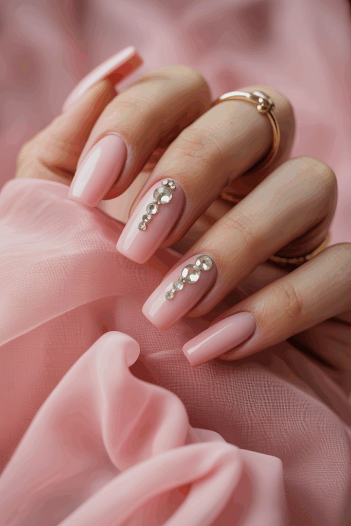 Adding rhinestones to soft pink nails creates a delicate sparkle. Small rhinestone accents can be placed near the cuticle or along the nail tips to add shine without overwhelming the design.