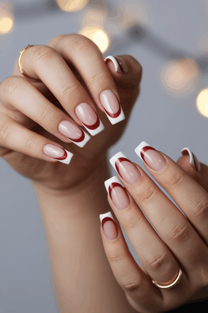 This design uses clean white French tips as the base. The red glitter adds a delicate sparkle without overpowering the look.