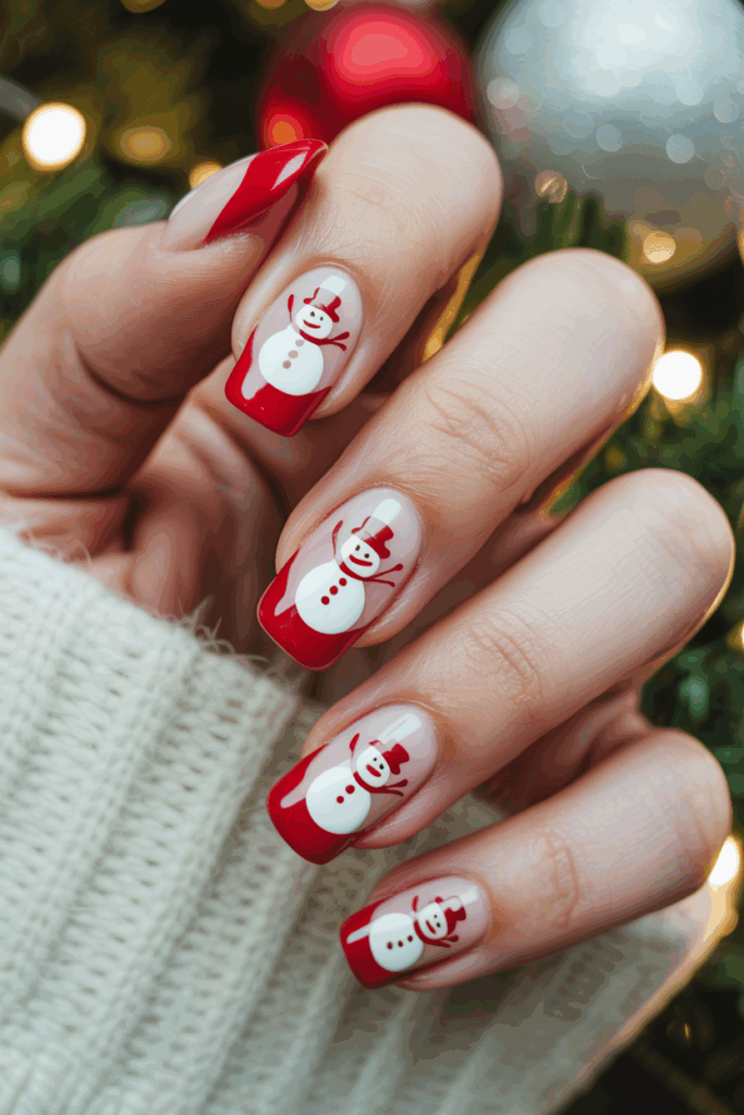 This design uses bright red tips for a strong holiday look. The white snowman silhouettes stand out clearly on each nail.