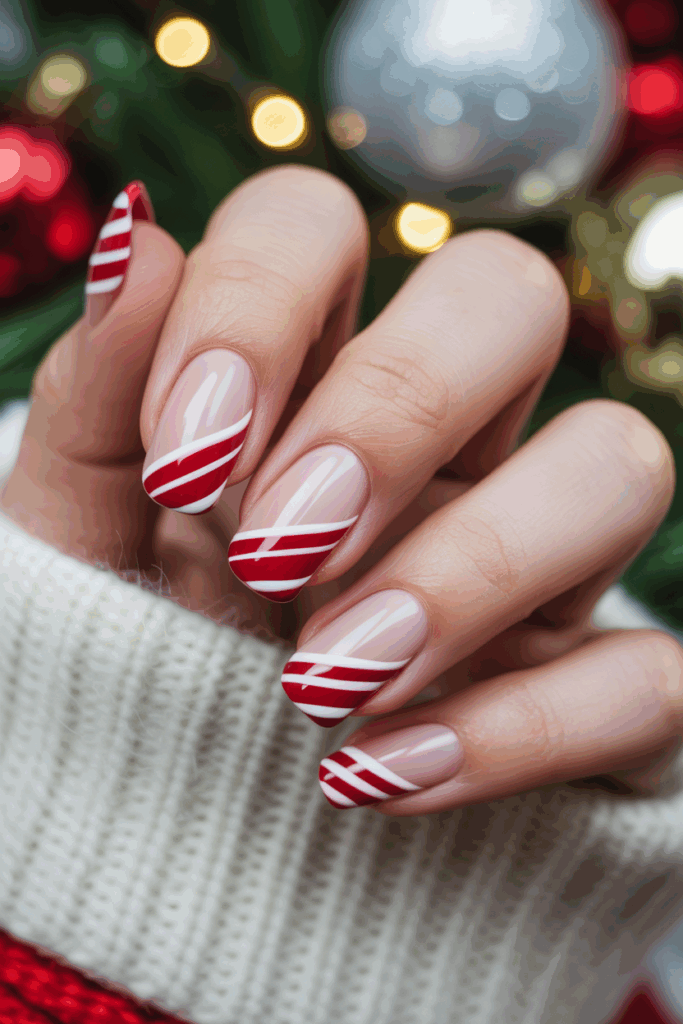 The candy cane pattern creates a clear holiday vibe. It works well on both long and short nails.