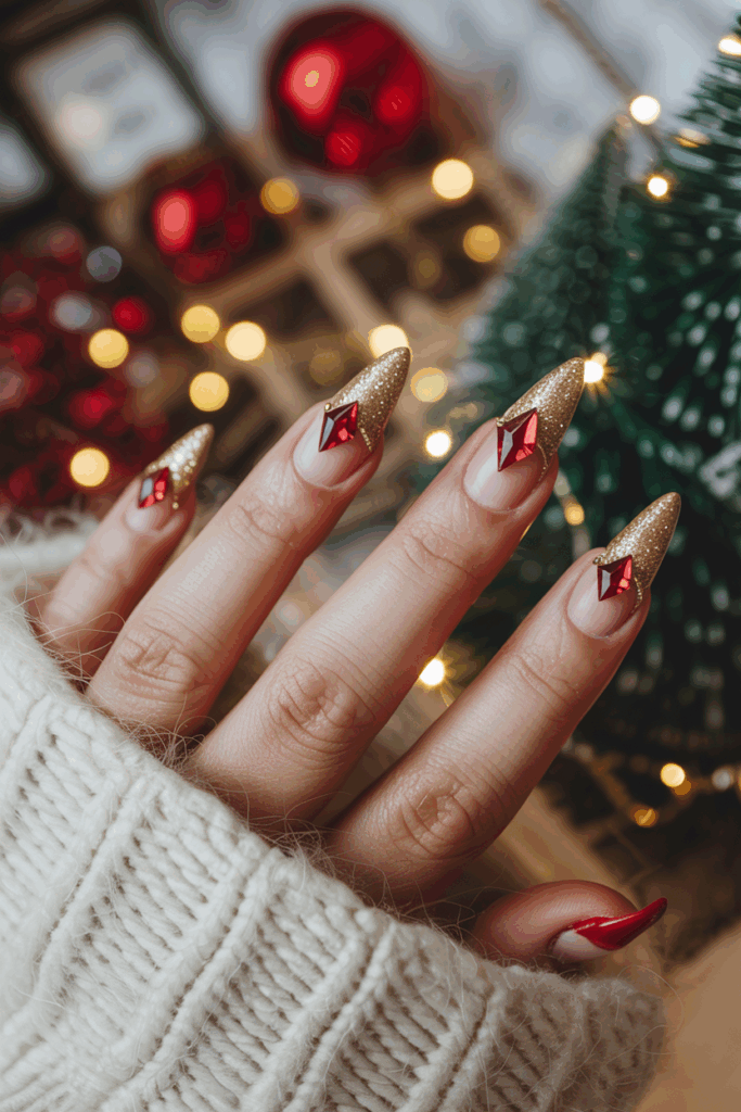 This design pairs glittery gold French tips with small red jewels. The gold adds a festive shine that catches the light.