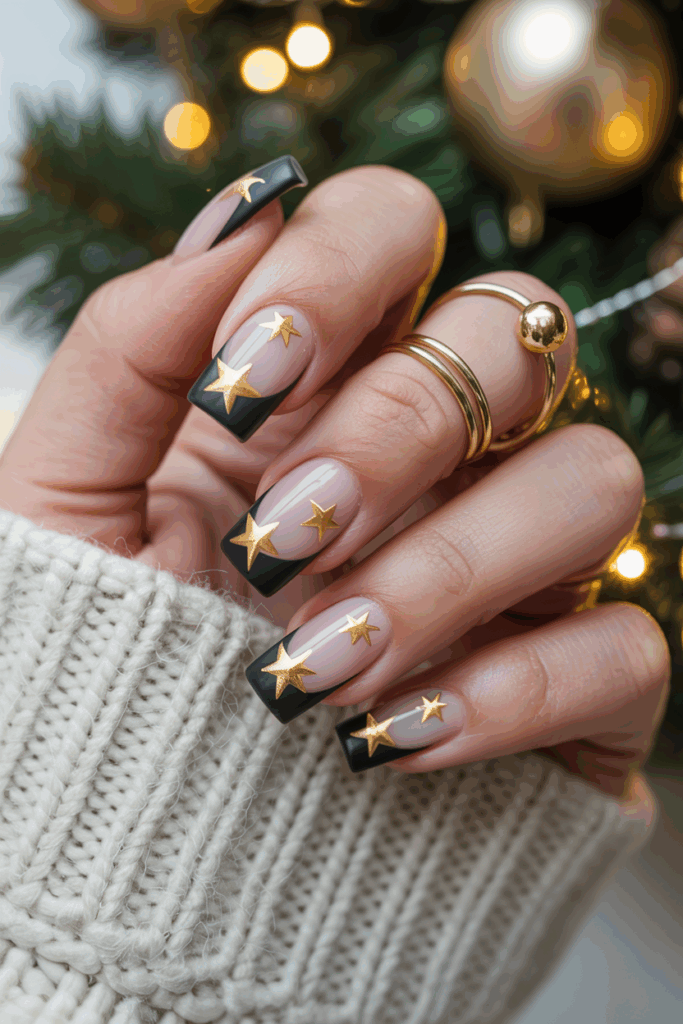 The gold stars add a festive touch without being too flashy. It suits those who want a simple yet elegant holiday manicure.