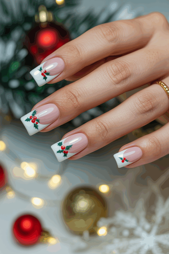 The contrast between the clear nails and white tips highlights the green holly leaves and red berries. It’s a balanced way to celebrate the season with grace.
