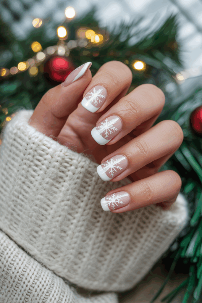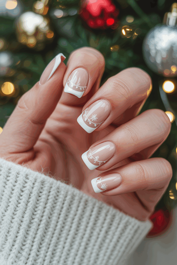 Nude nails with classic white French tips create a clean and elegant look. This style keeps nails simple but polished for the holiday season.