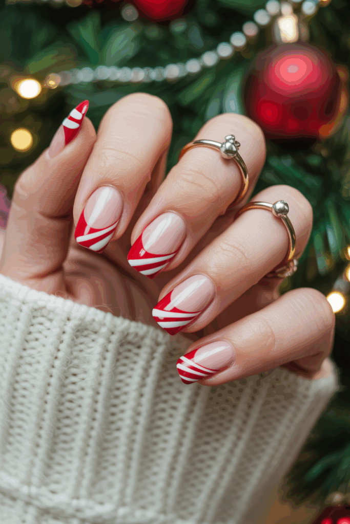 This design uses bold red tips as the base for classic white candy cane stripes. It adds a festive touch without being too busy.