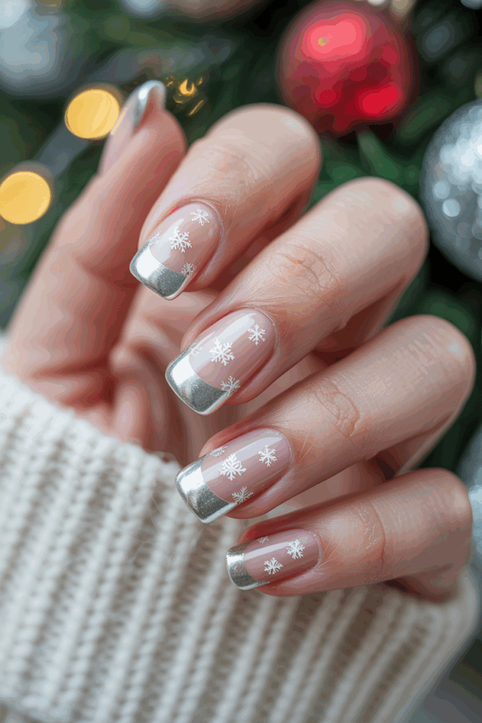 Silver chrome tips offer a sleek and shiny base for a holiday look. The mirror-like finish adds a modern touch to classic French tips.