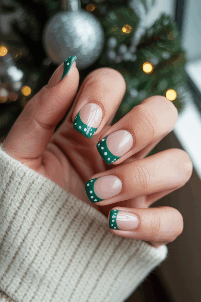 Together, the shimmer and green dots create a balanced, modern style. It works well for anyone who wants holiday nails that stay classy and understated.