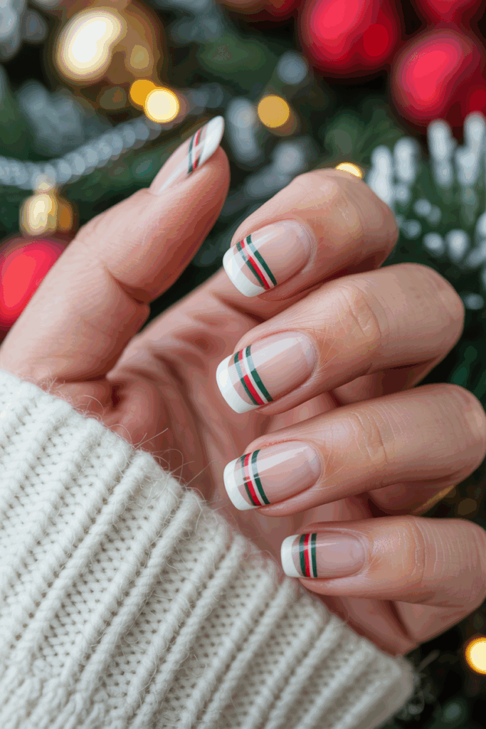 It offers a festive twist while keeping the classic French manicure shape. The diagonal lines add visual interest without being too busy.