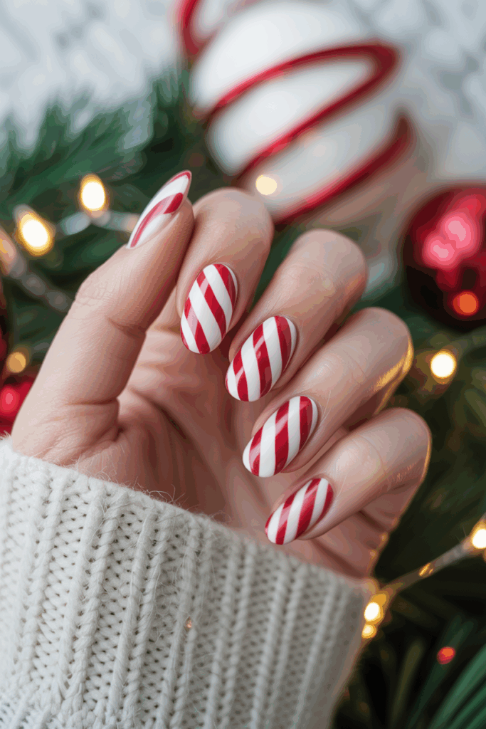 3) Candy Cane Stripe Nails on Short Almond Shape