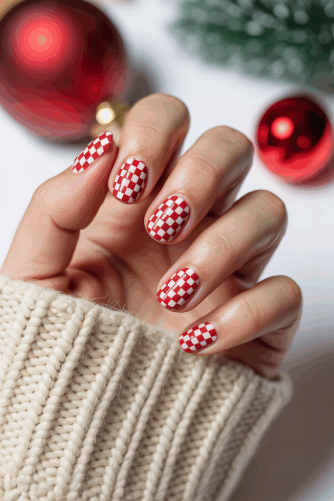 Checkerboard nails use alternating red and white squares for a clean, festive look.