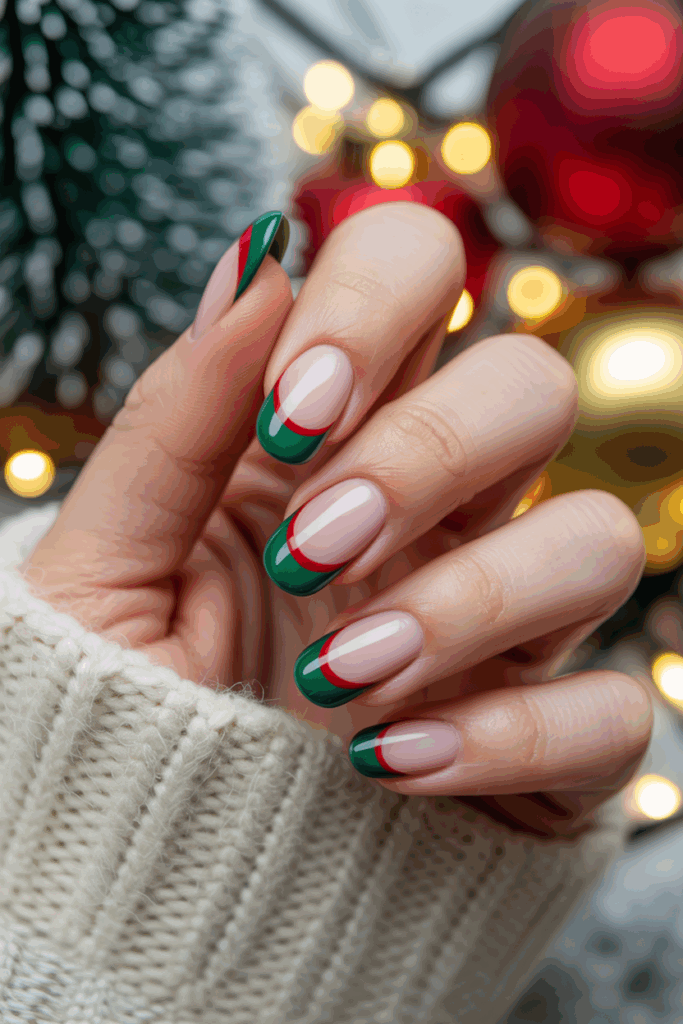 Classic green and red French tips offer a simple yet festive look. The tips are painted in deep green and bright red over a neutral base. This style is perfect for holiday events and adds subtle Christmas cheer without being too bold.