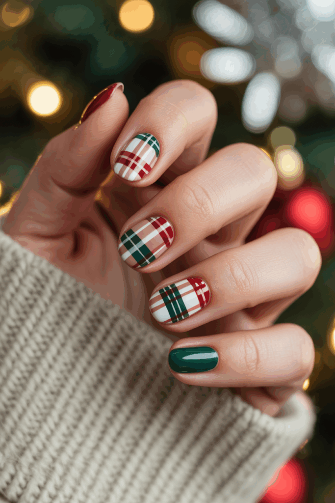 Medium nails offer the perfect space for classic plaid patterns. Red and black plaid creates a timeless holiday look that suits many styles.