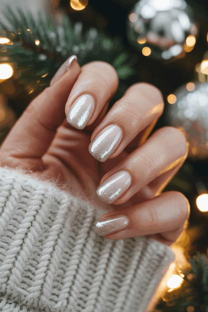 This design blends soft frosted colors that fade smoothly into one another. Silver sparkle is added to create a subtle shine. It offers a clean, festive look without being too bold. This style works well for those who want holiday nails with a simple, elegant touch.