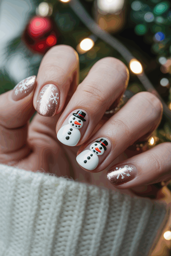Glossy white nails create a clean, bright base for snowman designs. The shiny finish makes the small snowman details stand out clearly. This look adds a playful yet simple touch to holiday nails.