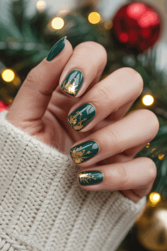 Gold foil accents add a simple yet elegant touch to dark green nails. The contrast between the deep green and shiny gold creates a festive, polished look. This design works well for both short and long nails, making it versatile for any holiday style.