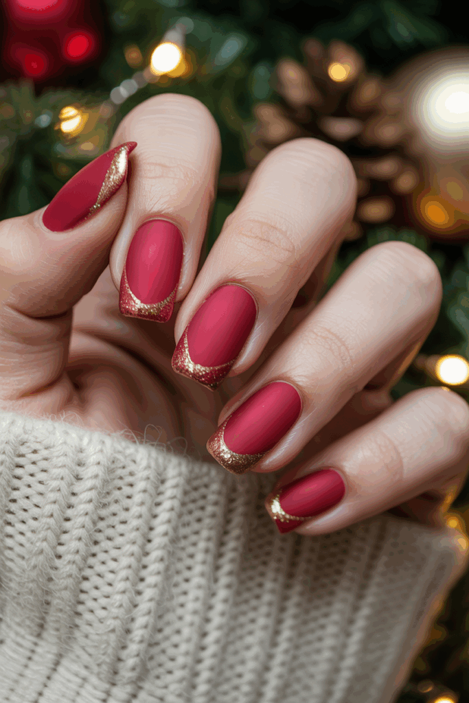 This design pairs a matte red base with delicate gold tips. The matte finish offers a smooth, understated look.
