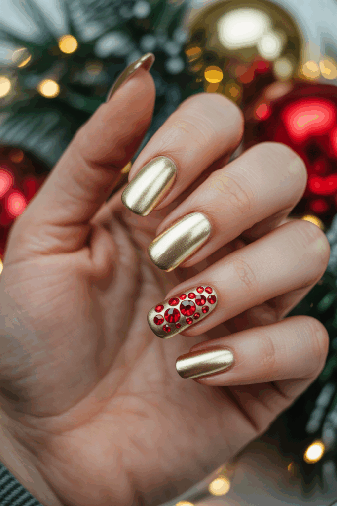 This design features shiny metallic gold nails for a festive look. Red rhinestones add a bright, eye-catching detail.