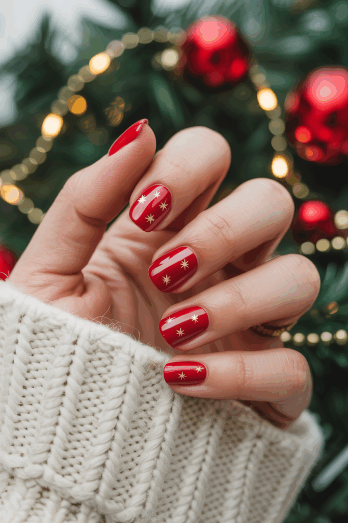 This design uses a simple red base for a classic holiday look. Tiny gold stars add a subtle sparkle without overwhelming the nails. It combines elegance with a festive touch, perfect for those who prefer a clean and chic style during the season.