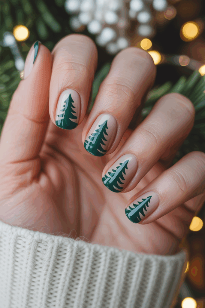 This design features simple pine tree shapes painted over a nude base. The neutral background highlights the dark green or black tree outlines. It offers a subtle but festive look suitable for many occasions. The style balances elegance with holiday spirit clearly and neatly.