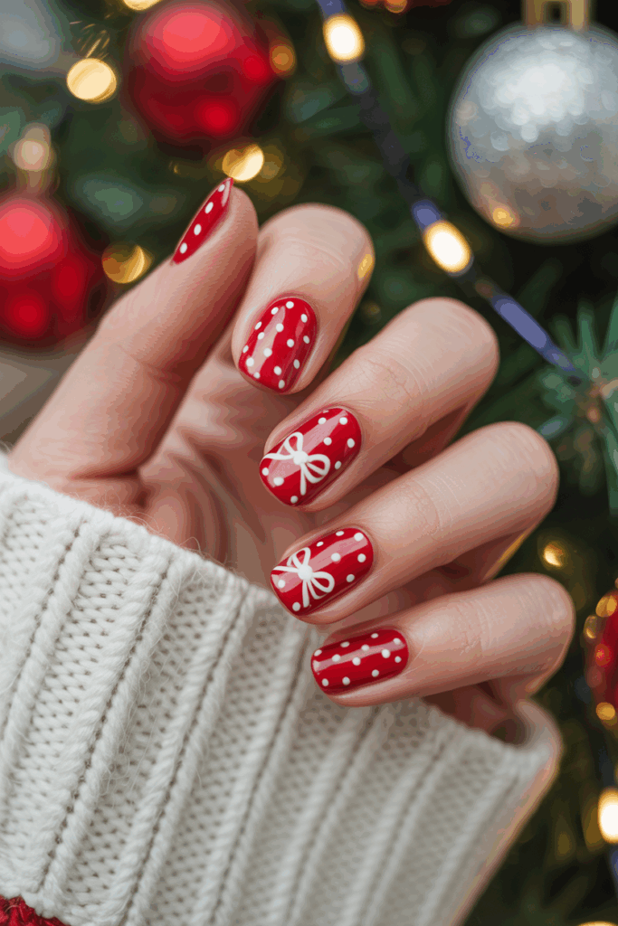 This design features red nails decorated with small white polka dots. Tiny white bows add a festive and delicate touch.