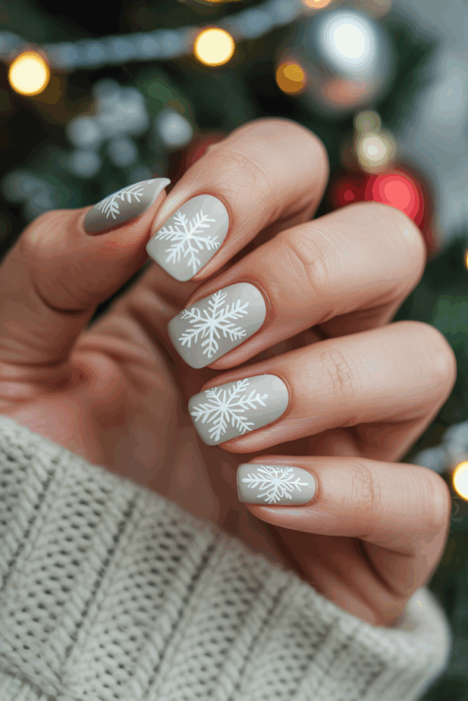 This style works well with delicate, simple snowflakes in silver or light blue. It suits both short and long nails, giving a subtle yet festive look.