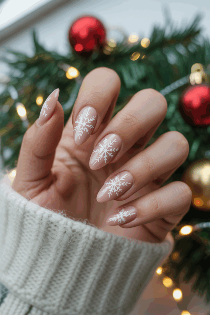 Almond-shaped nails offer a sleek and elegant look that suits many styles. Adding snowflake designs gives a festive and wintery touch, perfect for the holiday season.