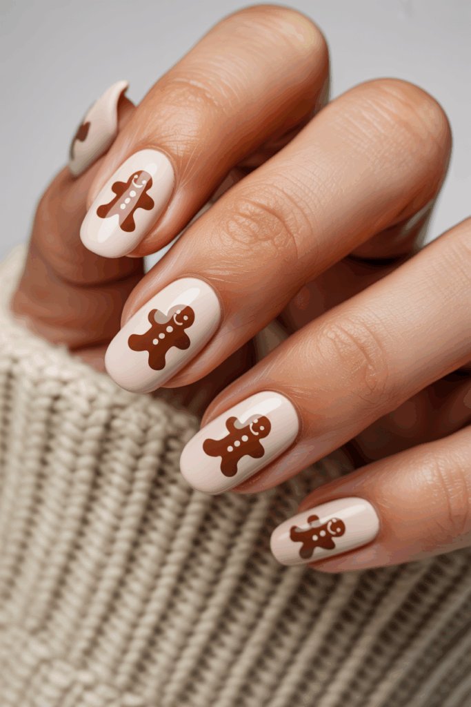 This nail design uses a simple nude base to highlight small gingerbread man motifs. The neutral color keeps the look calm and elegant.