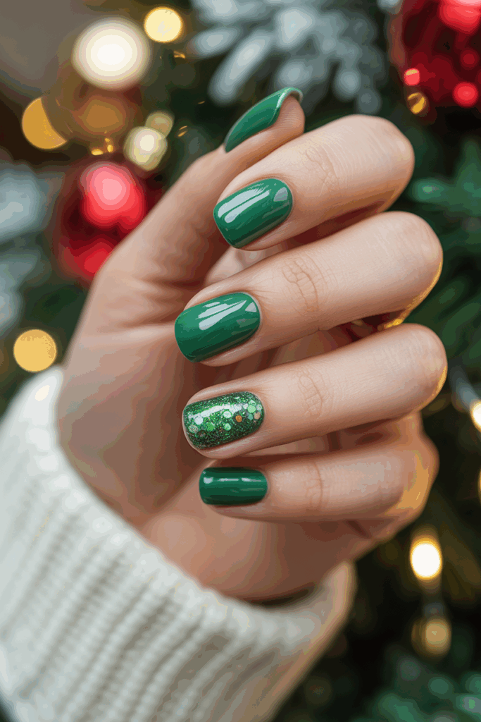 This design features a rich green base with a sparkly finish. The glitter adds a festive shine without being too bold.