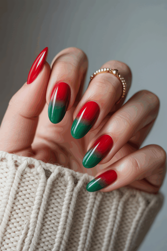 Red and green ombre nails blend two classic Christmas colors in a smooth gradient. This look adds depth without being too busy.