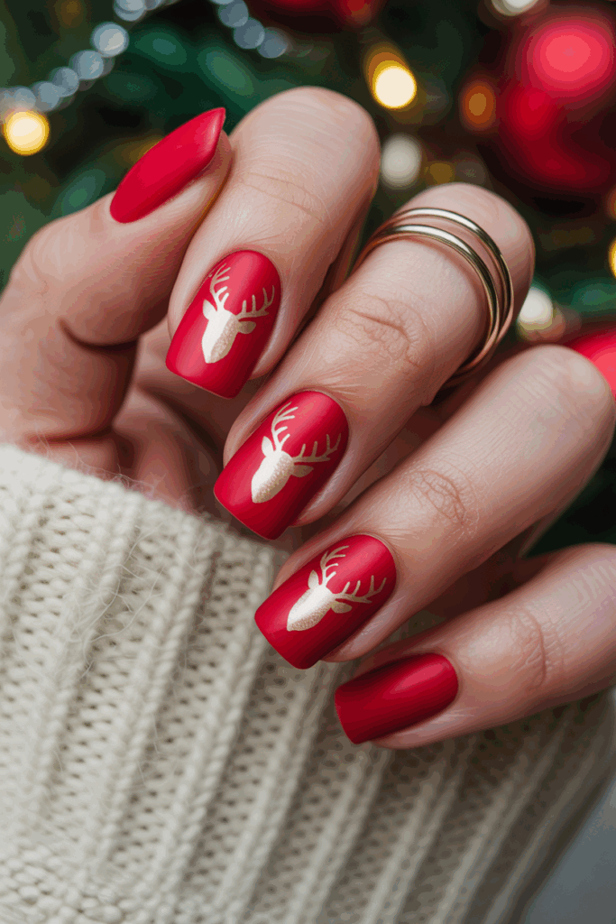 16) Red matte nails with glossy reindeer silhouettes
