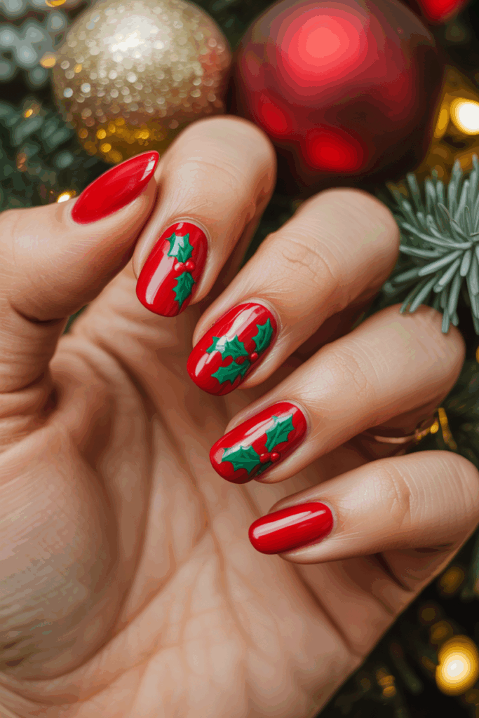 This design features bright red nails with small green holly leaves painted on one or two accent nails. The leaves are simple but add a festive touch.