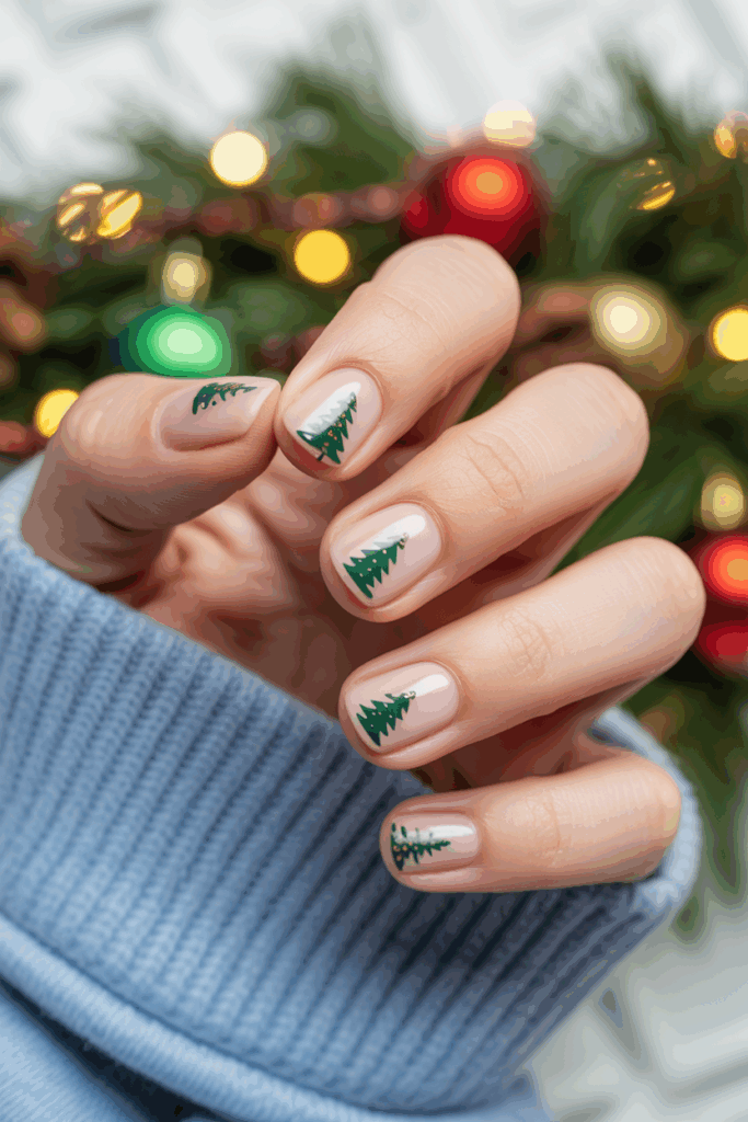 This style uses small, delicate Christmas tree designs on one or two nails. It works well with short nails because the details stay neat and clear.