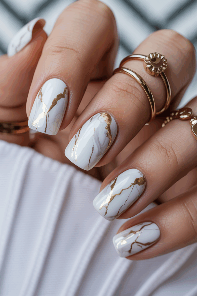 This design features a white base with gold veins running through it. The pattern looks natural and unique on each nail.