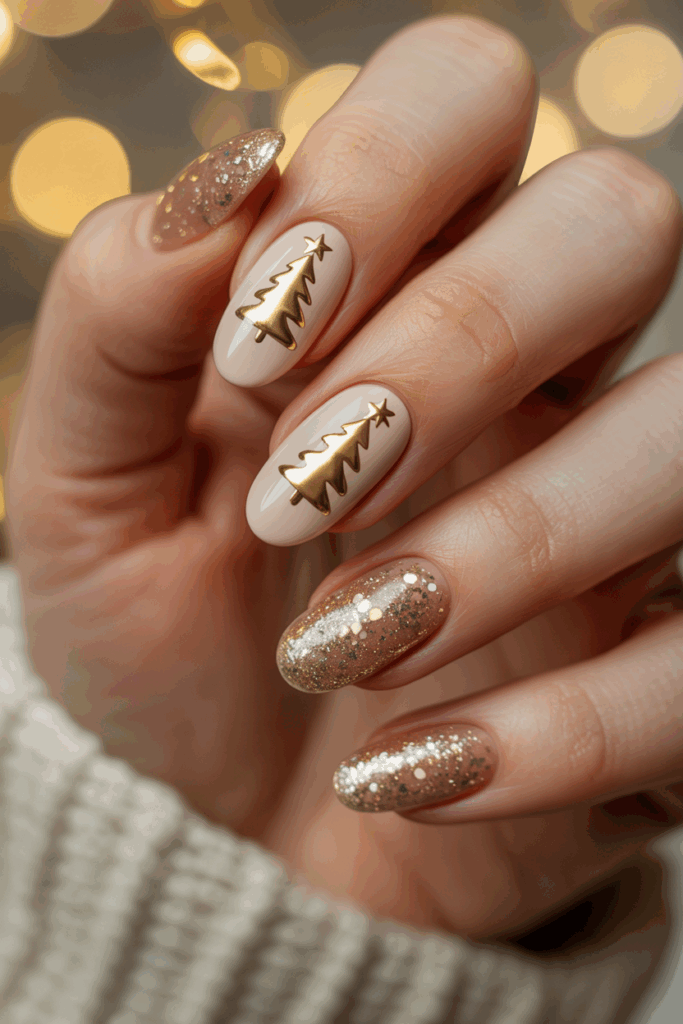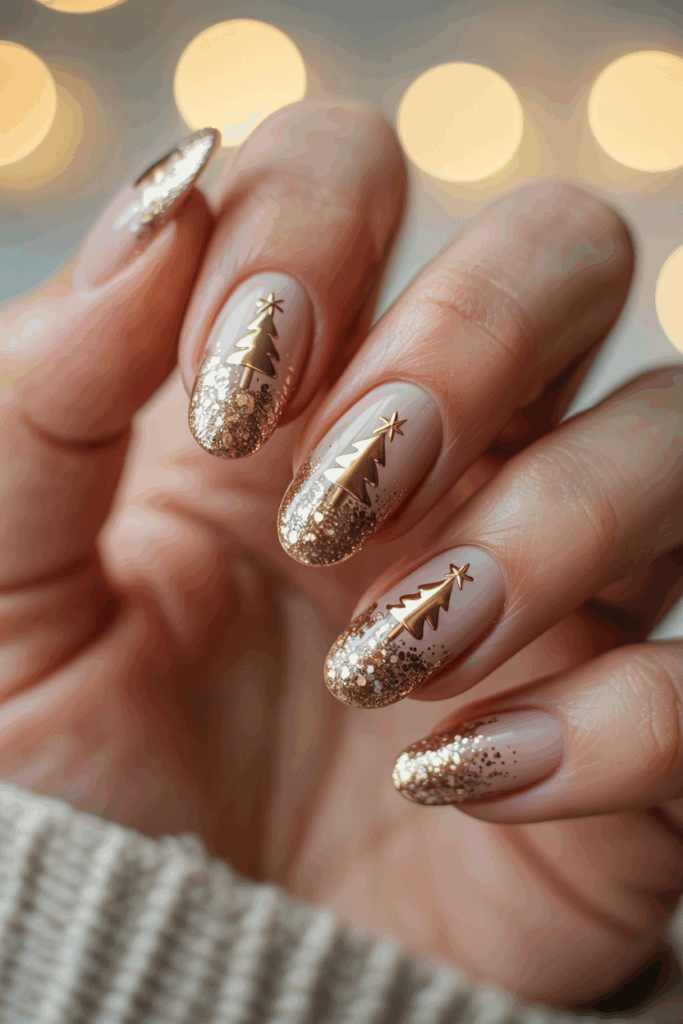 The combination of glitter and gold makes the nails look polished. It works well for someone who wants a subtle holiday style.