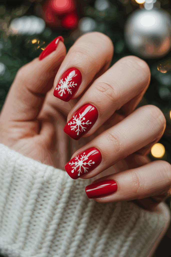 White snowflake accents are added on one or two nails. These simple designs stand out well against the red without looking too busy.