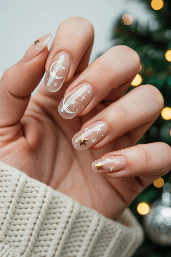 Clear nails create a clean and minimal base that highlights delicate gold stars and moon shapes. This style works well for those who want a subtle but festive look.