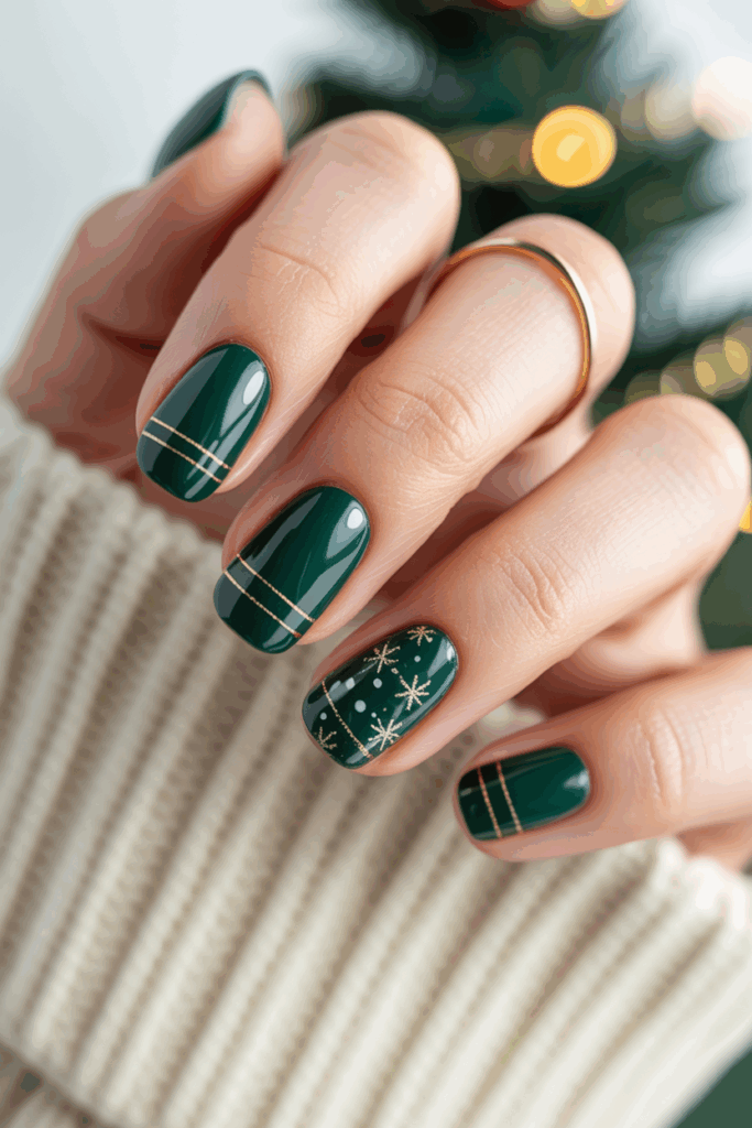 Dark green nails paired with thin gold lines create a simple yet elegant look. The gold lines add a touch of shine without overwhelming the rich green shade.