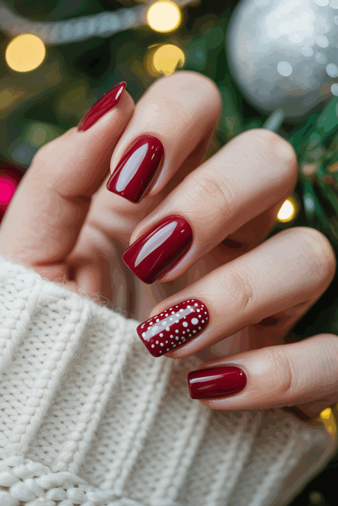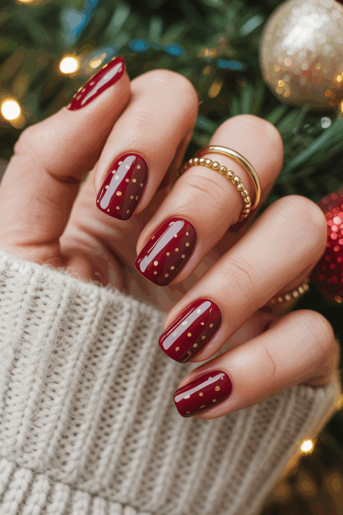 This nail design features a rich, glossy burgundy base that suits the Christmas season well. The tiny gold dots add a subtle sparkle without being overwhelming.