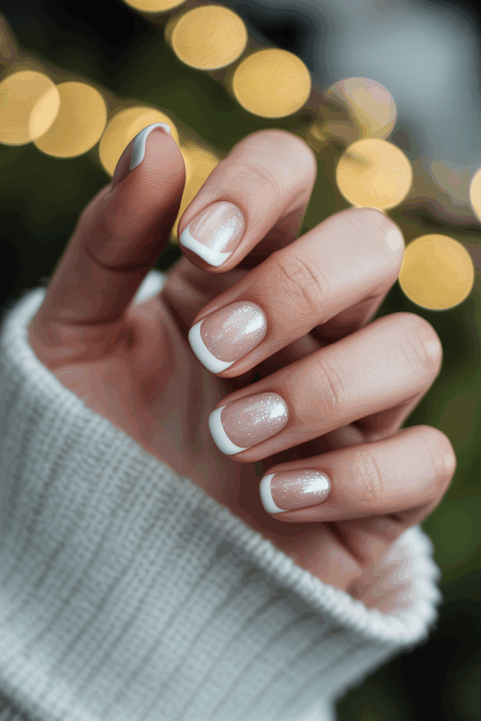 This design features clean white tips with a delicate touch of silver sparkle. It creates a simple but festive look that suits many occasions.