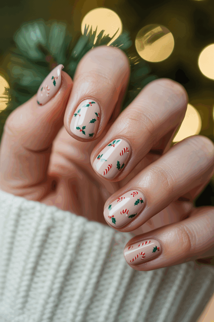 This design uses a simple nude base to keep the nails looking clean and elegant. Small festive icons like holly leaves, candy canes, and stars are placed carefully on each nail.