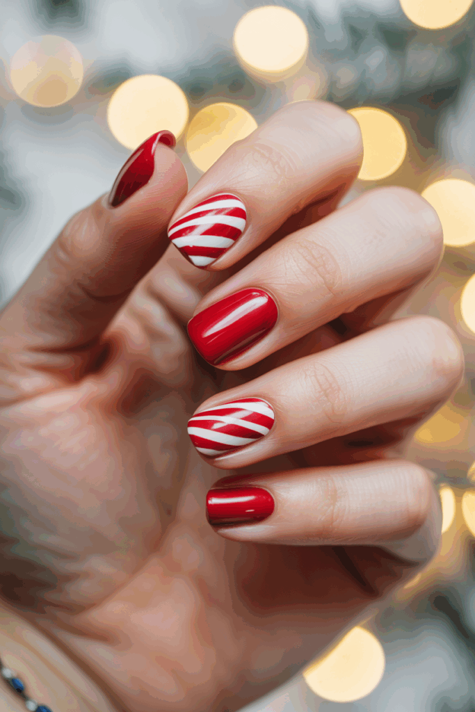 This design keeps most nails in a solid color, usually red, for a clean look. The two accent nails have classic candy cane stripes in red and white.
