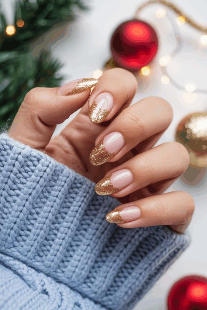 A glittery French manicure adds a festive touch without being too bold. It keeps the classic look but uses sparkle on the tips to capture holiday cheer.
