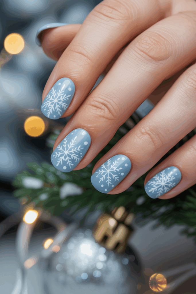 Snowflake patterns on pale blue nails create a soft and elegant look. The light blue color resembles a winter sky, making it perfect for the holiday season.