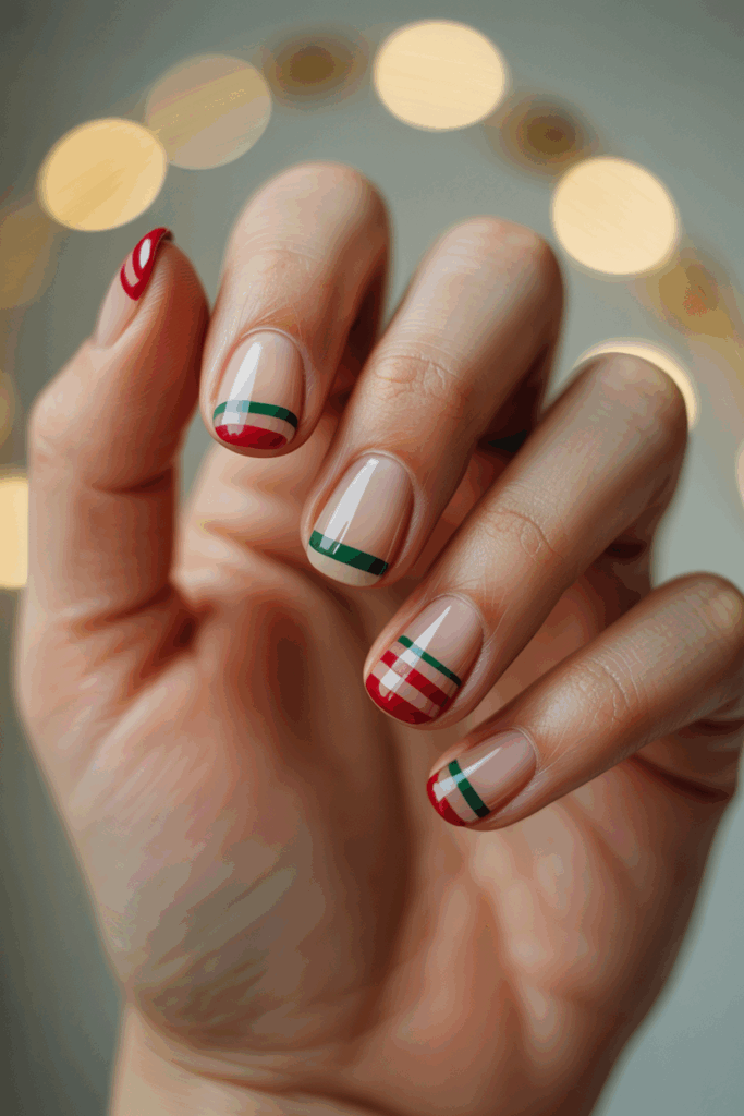 This design uses a soft beige base to keep nails neutral and elegant. Thin red and green stripes are added for a subtle holiday touch.