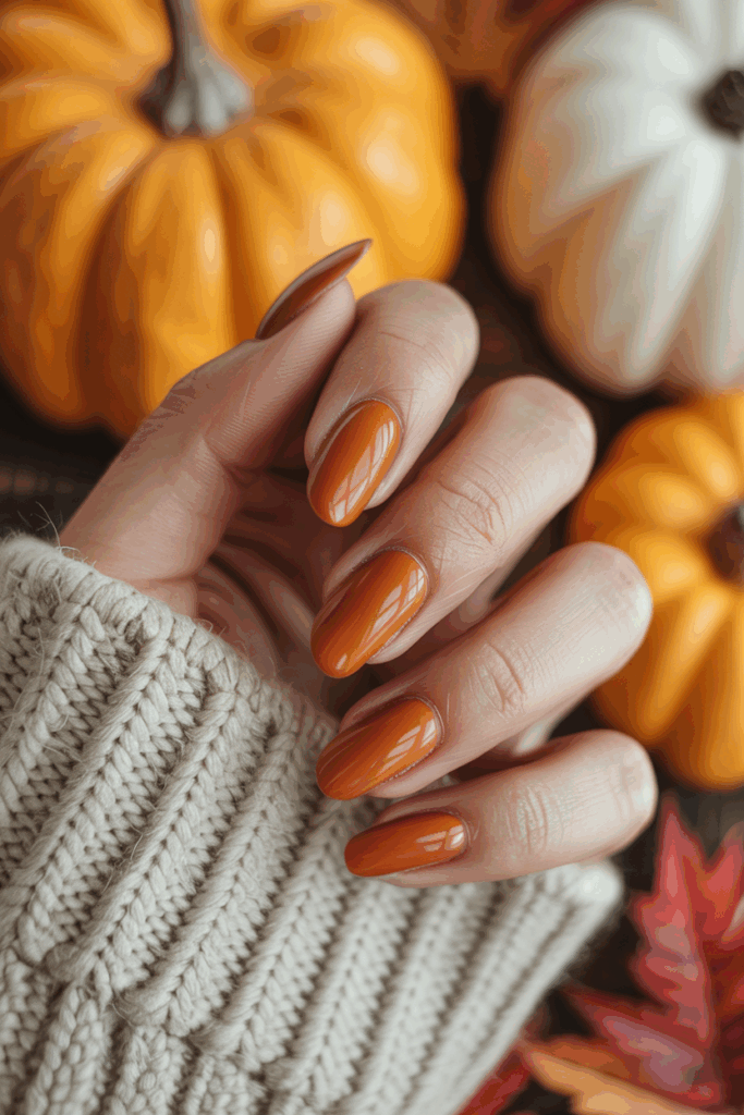 Burnt orange nails mirror the warmth of October sunsets and autumn leaves. The shade is deeper and earthier than pumpkin orange, making it chic and wearable.