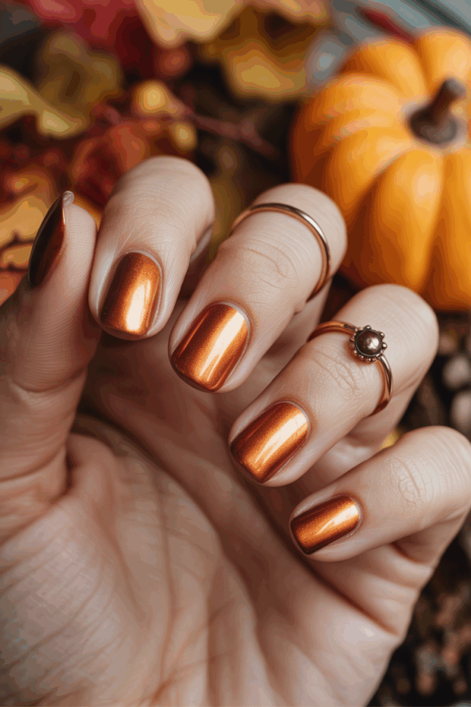 Copper nails glow with warmth and seasonal charm. The metallic shade reflects the richness of fall décor and autumn sunsets.
