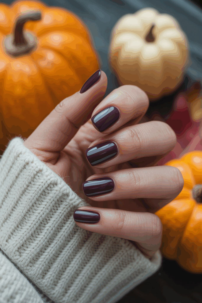 Plum nails offer a bold, dramatic twist on classic fall shades. The deep purple hue feels mysterious and elegant, perfect for cozy autumn nights.